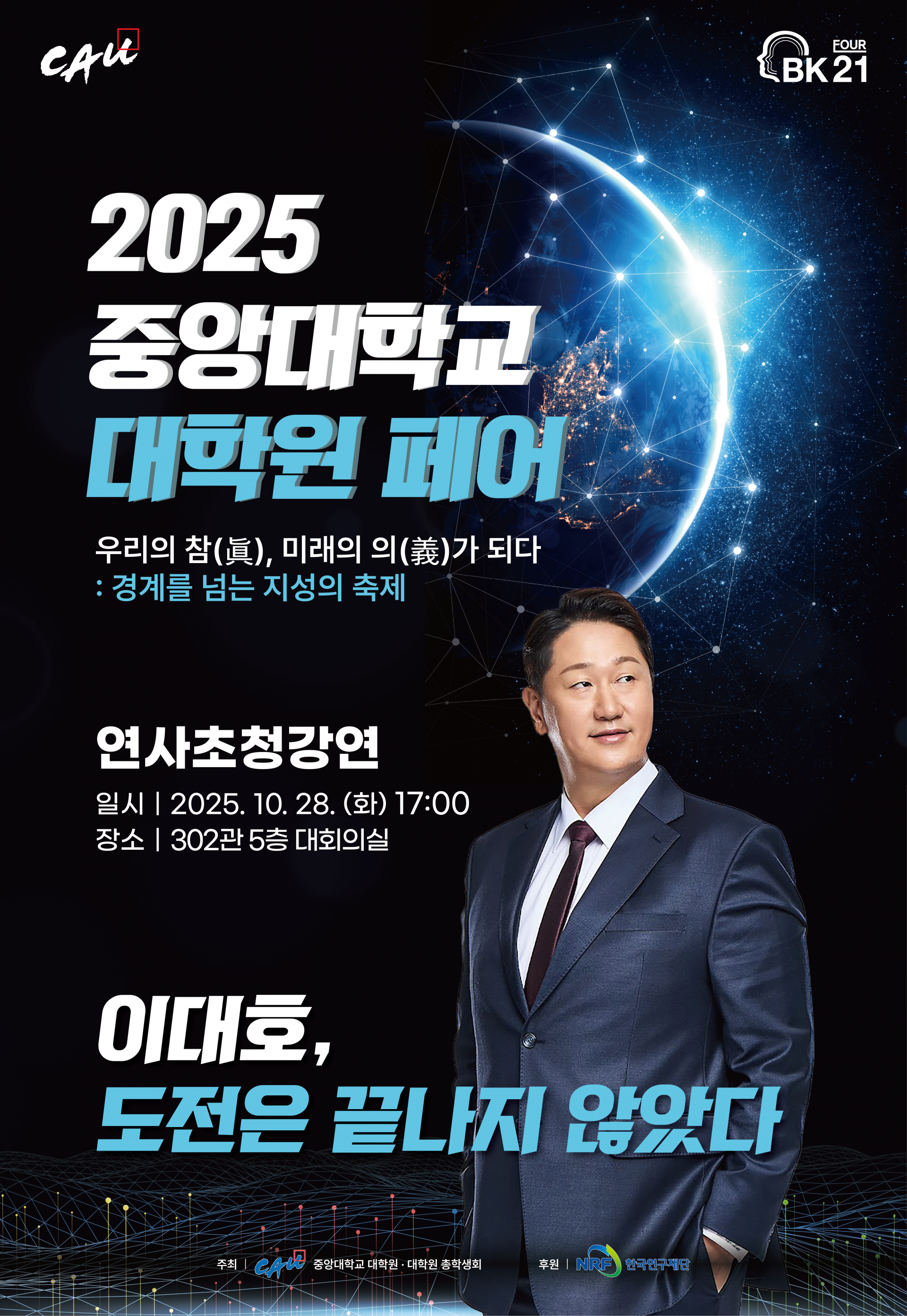중앙대학교 일반대학원 원우분들의 다양한 학문 간 연구와 성과를 공유하며, 활발한 학술활동을 격려하고자 2025 CAU 대학원 FAIR를 개최합니다.