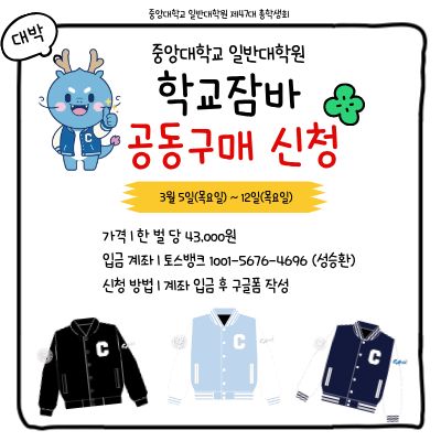 새학기 개강을 맞이하여 2026 중앙대학교 일반대학원 학교잠바 공동구매를 기획하였습니다.