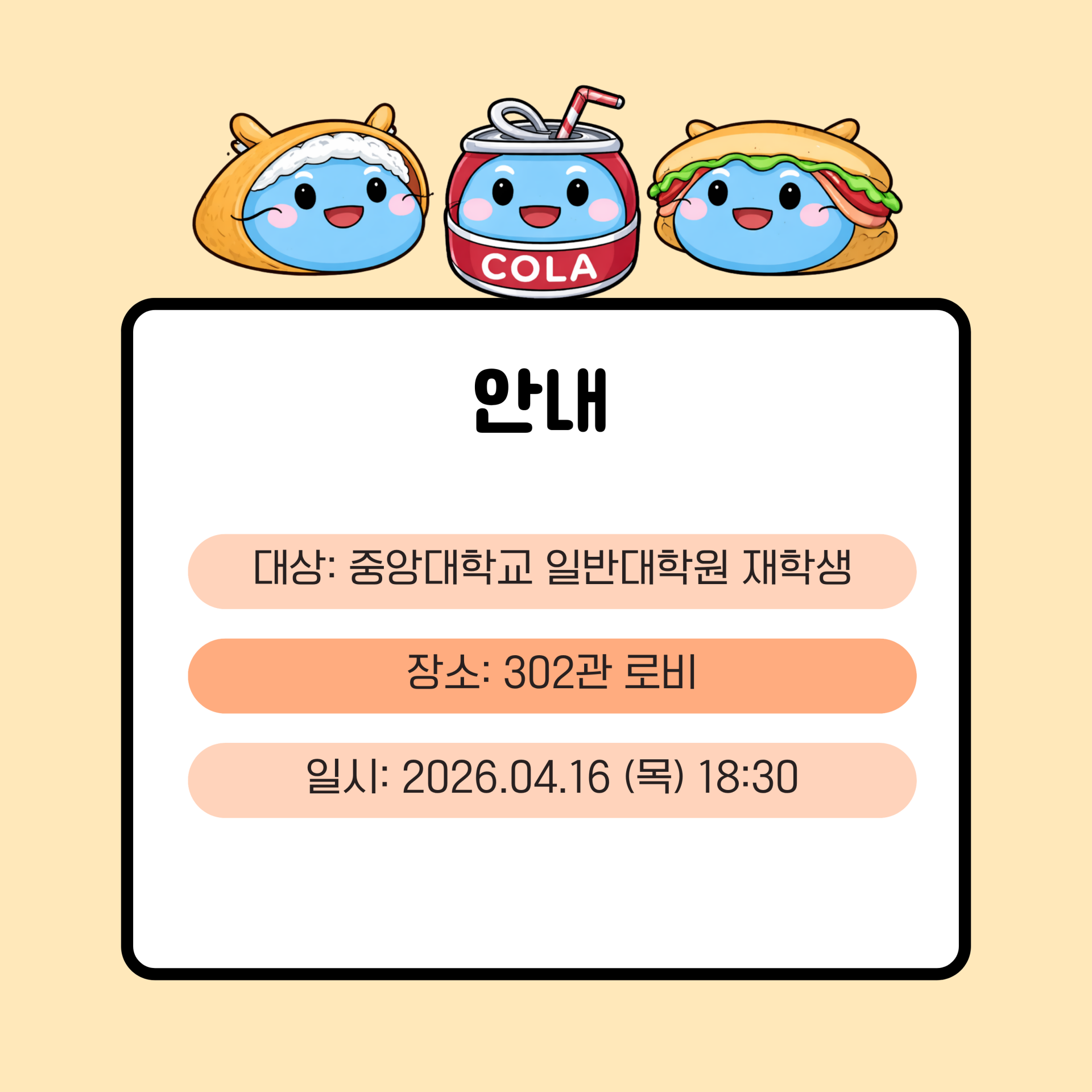 중앙대학교 일반대학원 제47대 총학생회에서 중간고사 간식행사를 진행합니다. 많은 참여 부탁드립니다.